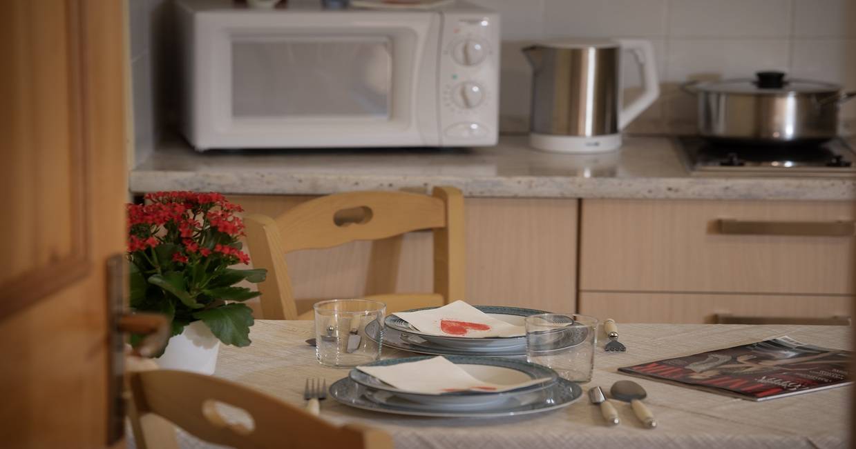 È provvisto di un angolo cottura con forno a microonde,